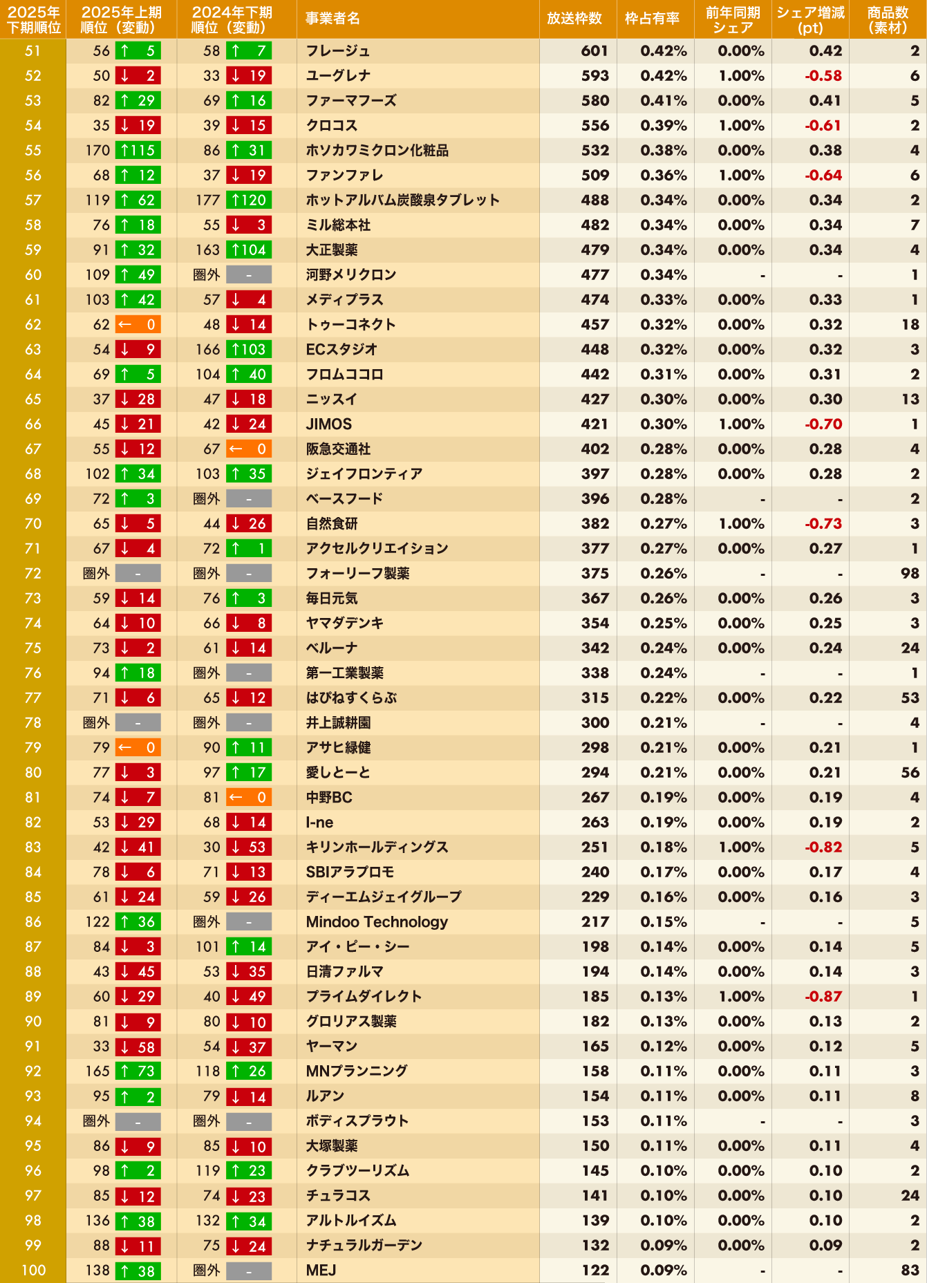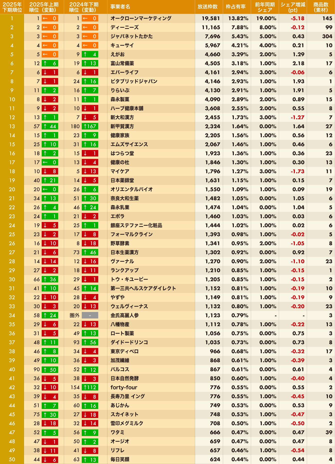 2025年下期の出稿枠数1位はオークローンマーケティング、2位はディーニーズ、3位はジャパネットたかたでした。これら上位3社は2025年上期、2024年下期と変化はありませんが、首位のオークローンマーケティングは前年同時期で枠の面積シェアが約5%減少しています。今期特筆すべき点としては、2024年下期と比較して大幅に順位を上げた、富山常備薬(19位→6位)、ビタブリッドジャパン(24位→8位)、新甲賀漢方(180位→13位)の3社が挙げられます。